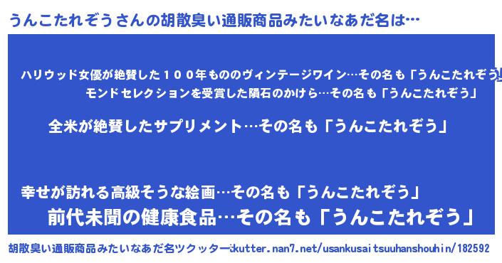 男性向けラノベタイトル風あだ名 | 『うんこたれぞうの嫁は女の子じゃないと思った?』 |