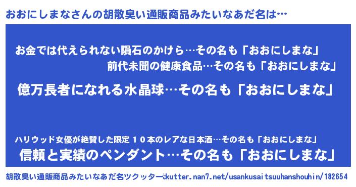 | 男性向けラノベタイトル風あだ名 | 『おおにしまなに滅ぼされるだけの簡単なお仕事です』 |