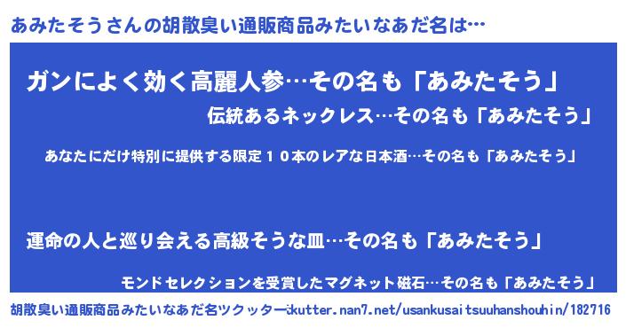 | 意味不明あだ名 | 『住所不定無職あみたそう(53歳)』 |