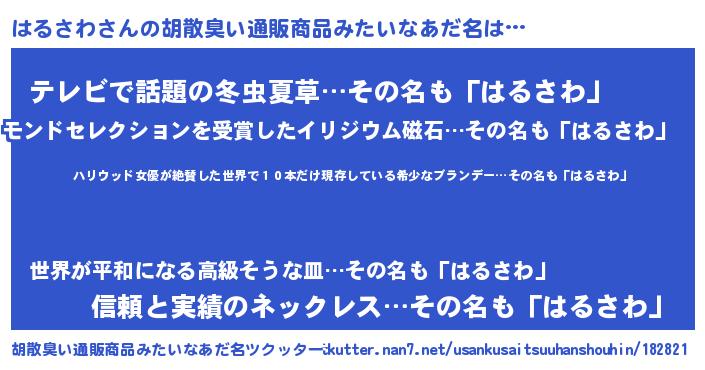 | 男性向けラノベタイトル風あだ名 | 『魔弾の王とはるさわ』 |