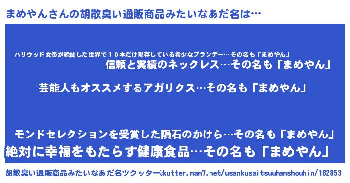 | 恥ずかしいあだ名 | 『マメヤンデラックス』『まめちん』 |