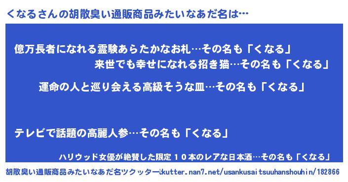 | 男性向けラノベタイトル風あだ名 | 『くなるに滅ぼされるだけの簡単なお仕事です』 |