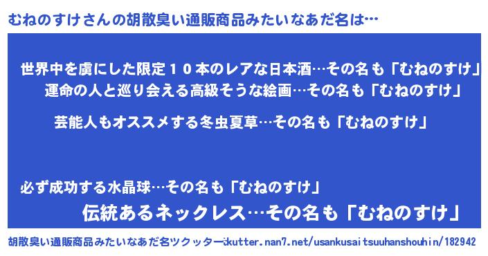 | 意味不明あだ名 | 『自称むねのすけ』『ペロリンむねのすけ』 |
