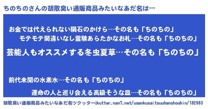 | 男性向けラノベタイトル風あだ名 | 『Re:ちのちのから始める異世界生活』 |