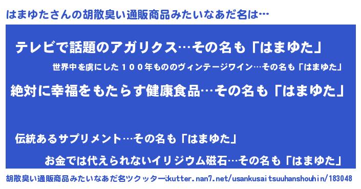 | 男性向けラノベタイトル風あだ名 | 『はまゆたという概念が存在しない退屈な世界 』 |