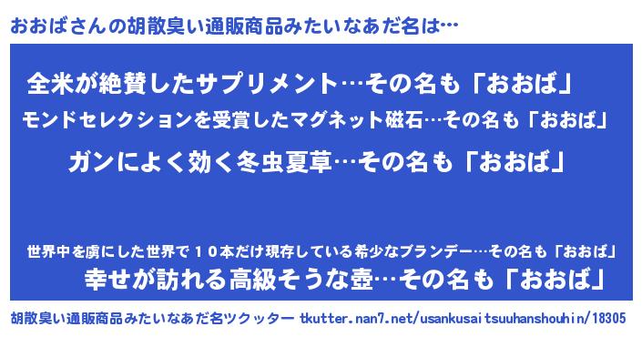 | 意味不明あだ名 | 『自称おおば』『とにかく怪しいおおば』 |