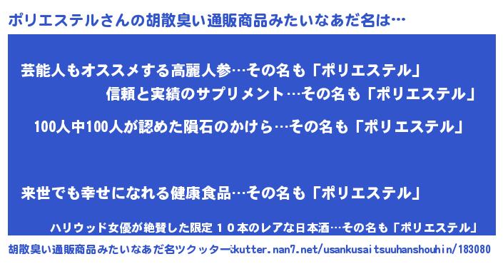 | 男性向けラノベタイトル風あだ名 | 『はたらくポリエステルさま!』 |