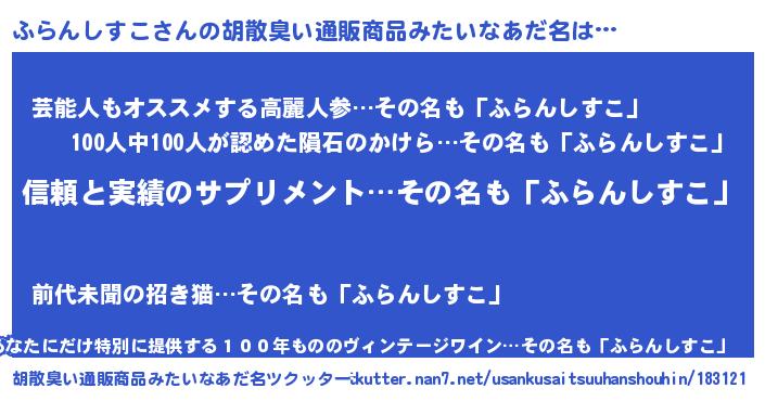 | ヘコむあだ名 | 『ふら太郎』『ふらんしすこ(小並感)』 |
