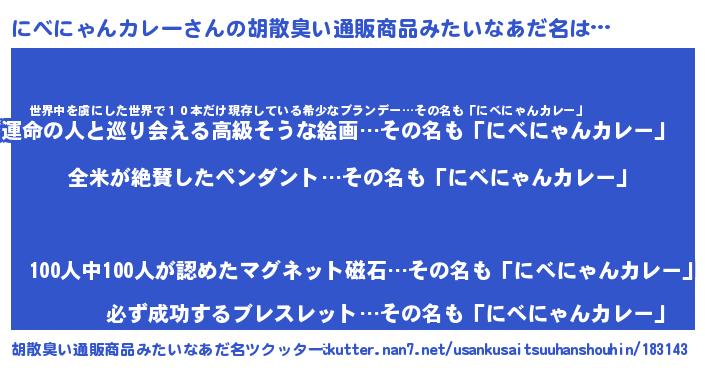 | 男性向けラノベタイトル風あだ名 | 『にべにゃんカレー~年齢イコール彼女いない歴の魔法使い~』 |