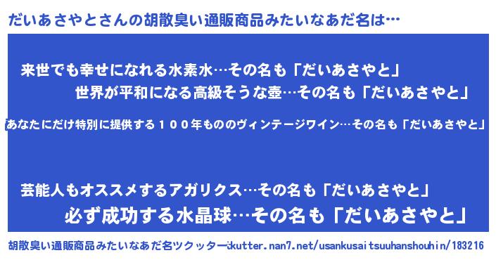 | 意味不明あだ名 | 『住所不定無職だいあさやと(3歳)』 |