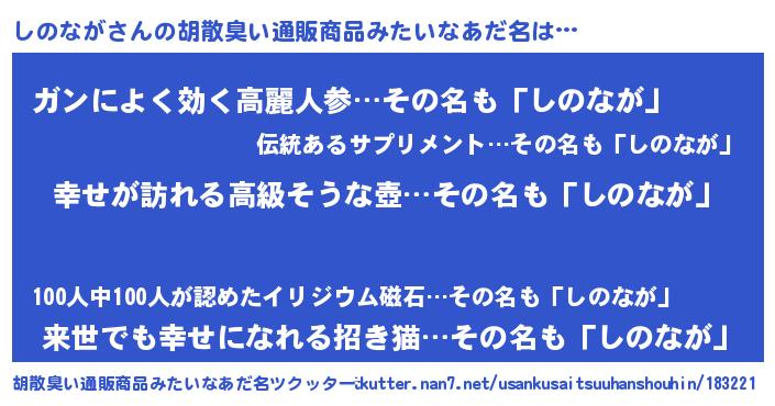 | 女子向けラノベタイトル風あだ名 | 『しのながの雑貨屋さん』『闇のしのなが』 |