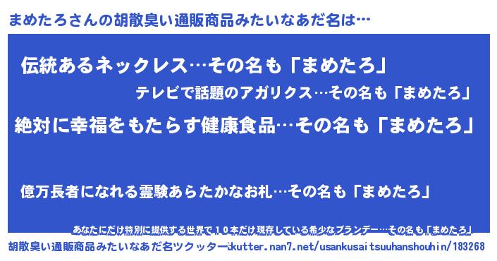 | 意味不明あだ名 | 『永久保存まめたろ』『自称まめたろ』 |