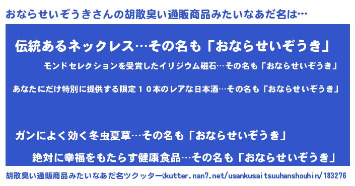 | 意味不明あだ名 | 『住所不定無職おならせいぞうき(14歳)』 |