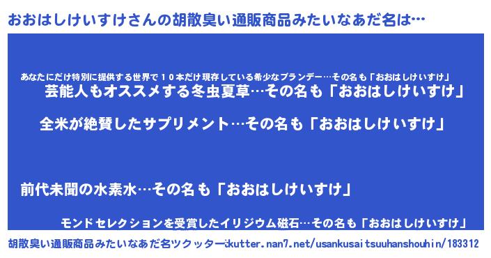 | 男性向けラノベタイトル風あだ名 | 『うちのおおはしけいすけが世界を掌握している!』 |
