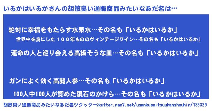 | 男性向けラノベタイトル風あだ名 | 『いるかはいるかに滅ぼされるだけの簡単なお仕事です』 |