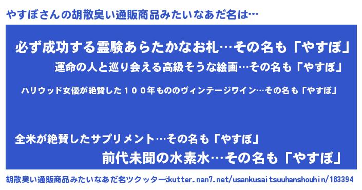 | 男性向けラノベタイトル風あだ名 | 『緋弾のヤスボ』『やすぼの憂鬱』 |