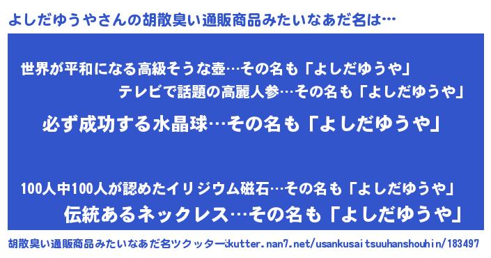 | ヒーロー風カッコイイあだ名 | 『スーパーヨシダユウヤ』『幻影騎士ヨシ』 |