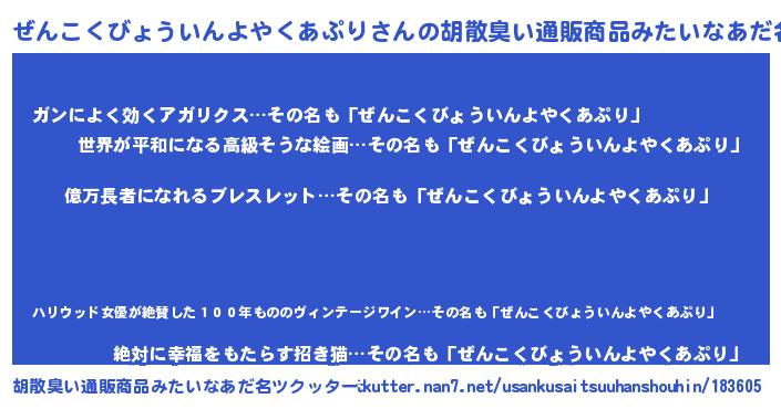 | 男性向けラノベタイトル風あだ名 | 『ゼンコクビョウインヨヤクアプリアートオンライン』 |
