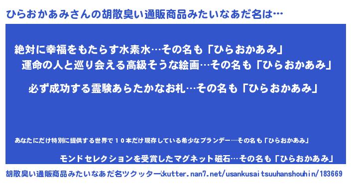 | 男性向けラノベタイトル風あだ名 | 『ひらおかあみの憂鬱』 |