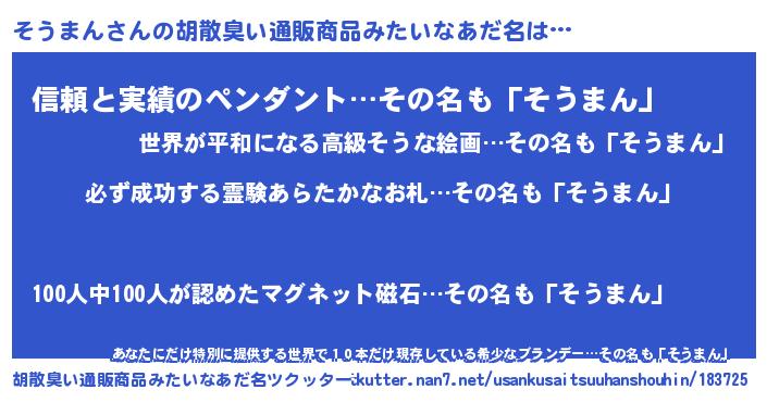 | 男性向けラノベタイトル風あだ名 | 『ソウマンスレイヤー』『そうまんの憂鬱』 |