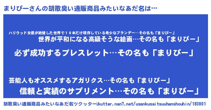 | 男性向けラノベタイトル風あだ名 | 『まりぴーの憂鬱』『緋弾のマリピー』 |