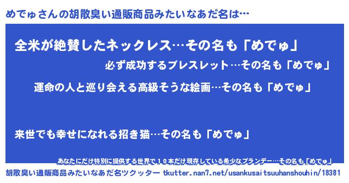 | 男性向けラノベタイトル風あだ名 | 『めでゅに滅ぼされるだけの簡単なお仕事です』 |