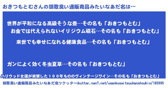 | ヘコむあだ名 | 『おきつもとむ(笑)』『なまこ酢』 |