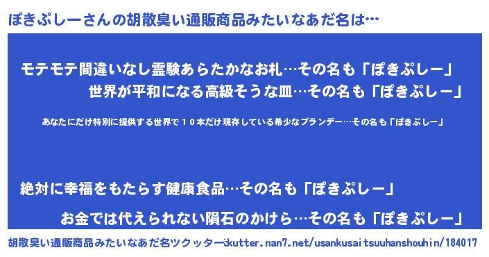 | 意味不明あだ名 | 『住所不定無職ぽきぷしー(93歳)』 |