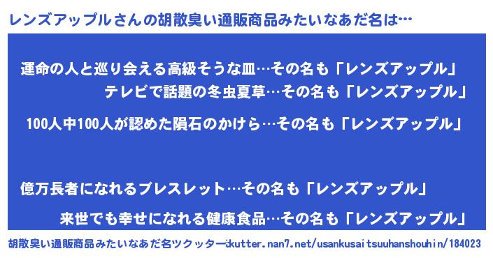 | 男性向けラノベタイトル風あだ名 | 『おまえをオタクにしてやるから、俺をレンズアップルにしてくれ! 』 |