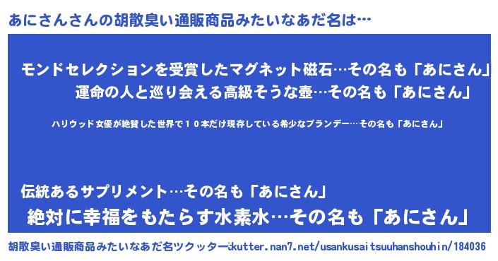 | ヘコむあだ名 | 『あにさん(震え声)』『酢こんぶ』 |