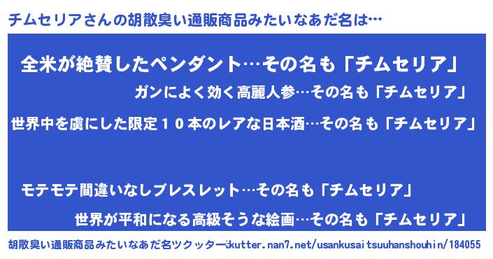 | 意味不明あだ名 | 『住所不定無職チムセリア(65歳)』 |