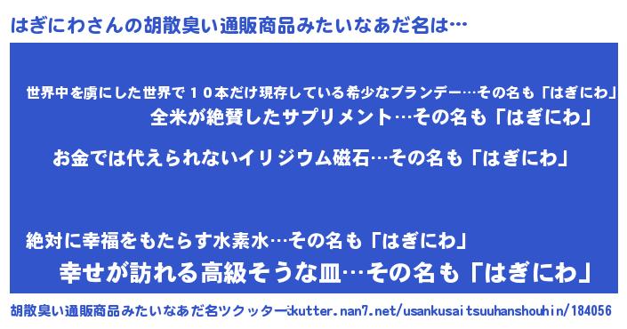 | 欧米人風あだ名 | 『ダニエルはぎにわ』『ウサインはぎにわ』 |