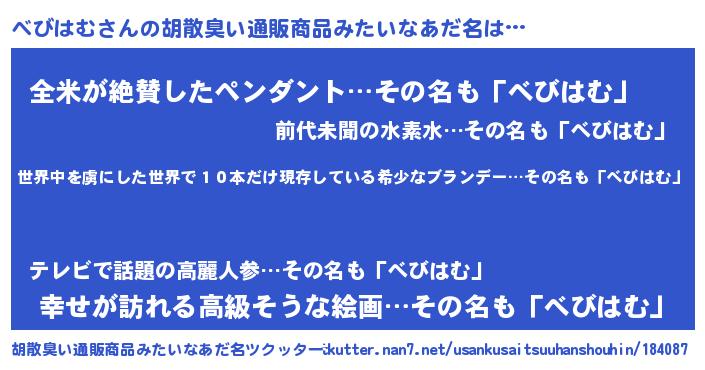 | 意味不明あだ名 | 『住所不定無職べびはむ(86歳)』 |