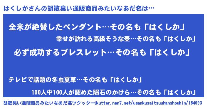 | 男性向けラノベタイトル風あだ名 | 『はくしかの憂鬱』『ハクシカスレイヤー』 |
