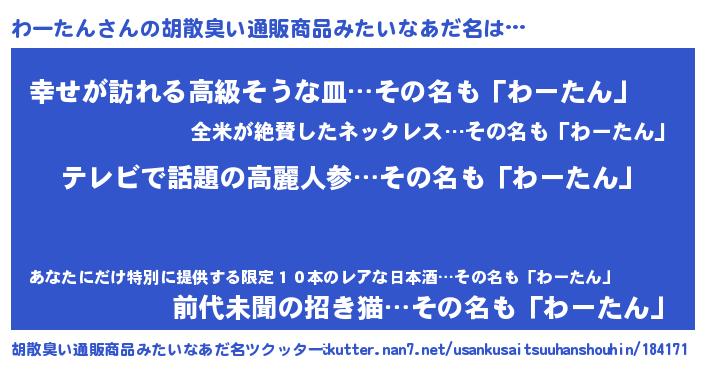 | 女子向けラノベタイトル風あだ名 | 『闇のわーたん』『わーたんの雑貨屋さん』 |