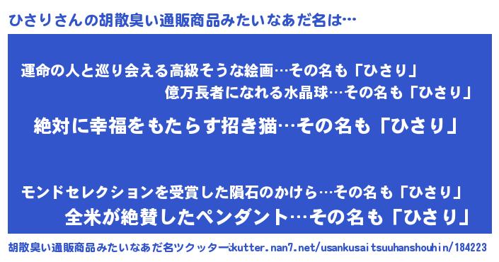 | 女子向けラノベタイトル風あだ名 | 『異世界で失敗しない100のひさり』 |