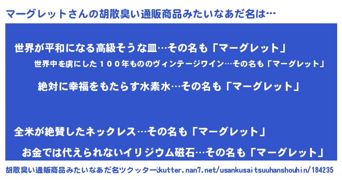 | 女子向けラノベタイトル風あだ名 | 『異世界で失敗しない100のマーグレット』 |