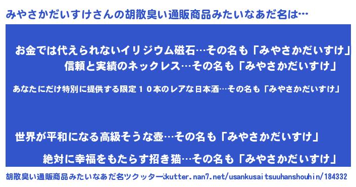 | 男性向けラノベタイトル風あだ名 | 『みやさかだいすけに滅ぼされるだけの簡単なお仕事です』 |