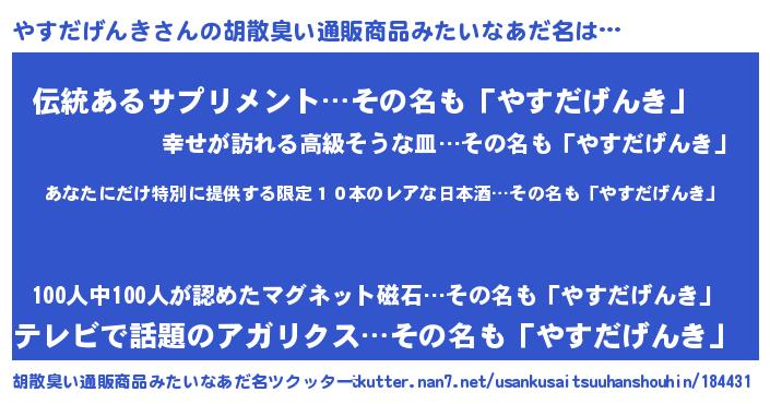 | 男性向けラノベタイトル風あだ名 | 『うちのやすだげんきが世界を掌握している!』 |