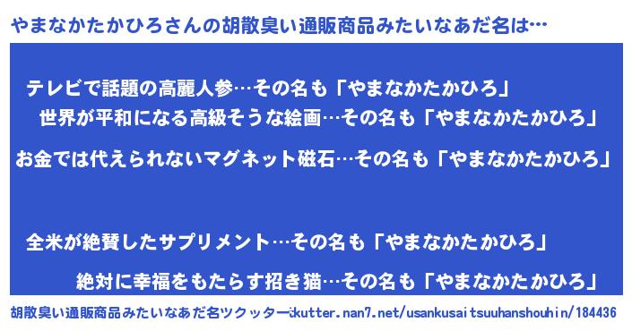 | 男性向けラノベタイトル風あだ名 | 『転生したらやまなかたかひろだった件』 |