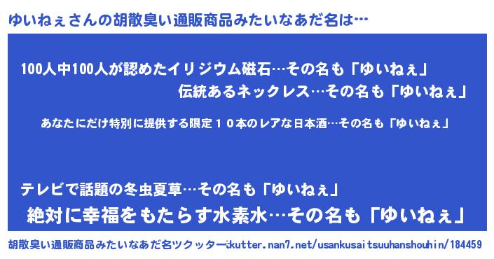| 男性向けラノベタイトル風あだ名 | 『この素晴らしい世界にゆいねぇを!』 |