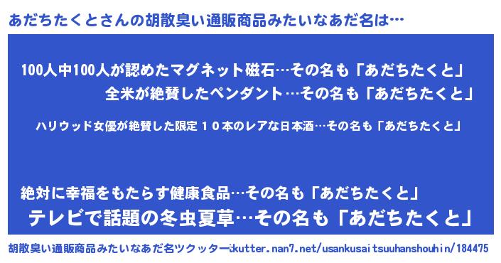 | 意味不明あだ名 | 『住所不定無職あだちたくと(65歳)』 |