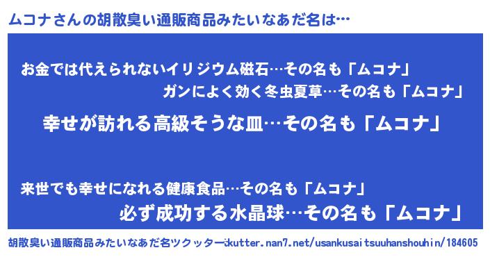 | 男性向けラノベタイトル風あだ名 | 『緋弾のムコナ』『ムコナの憂鬱』 |