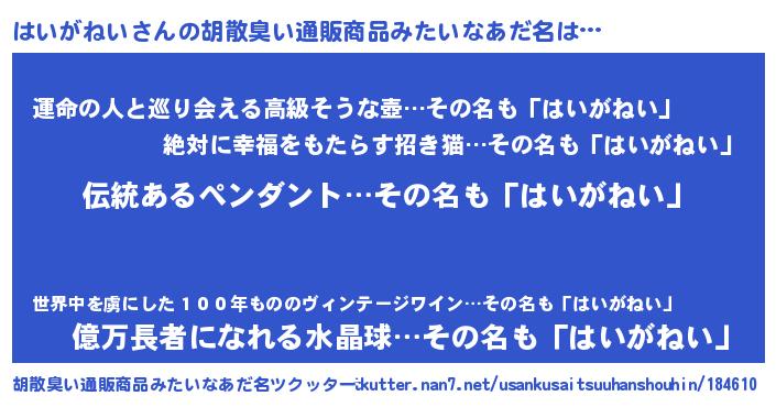 | 欧米人風あだ名 | 『はいがねい・ステッグマイヤー』 |