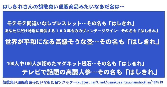 | 意味不明あだ名 | 『なめこ科はしきれ属』『自称はしきれ』 |