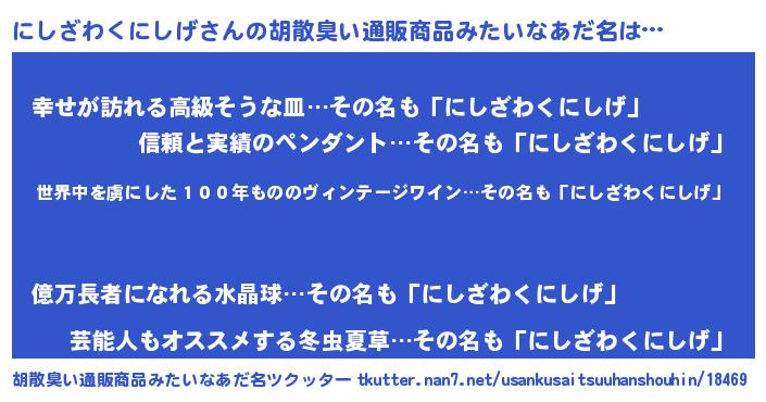 | 意味不明あだ名 | 『住所不定無職にしざわくにしげ(3歳)』 |