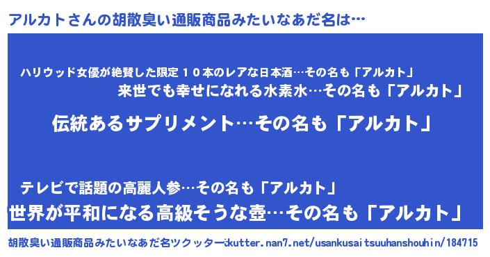 | 男性向けラノベタイトル風あだ名 | 『アルカトの嫁は女の子じゃないと思った?』 |
