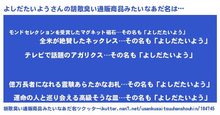 | 意味不明あだ名 | 『自称よしだたいよう』 |