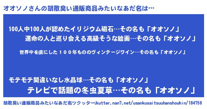 | 意味不明あだ名 | 『住所不定無職オオソノ(1歳)』 |