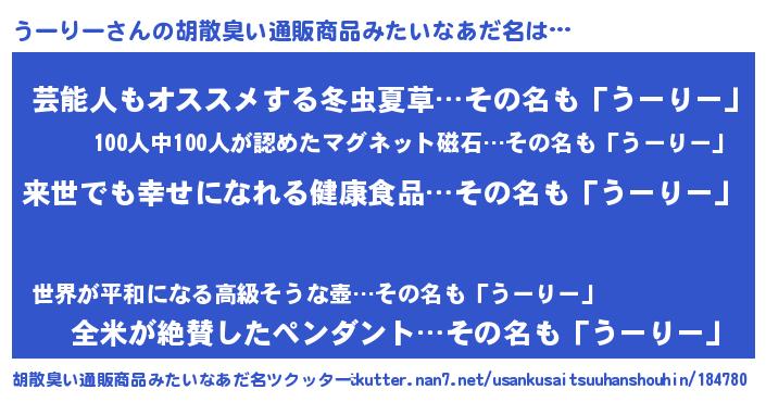| 男性向けラノベタイトル風あだ名 | 『はたらくうーりーさま!』 |